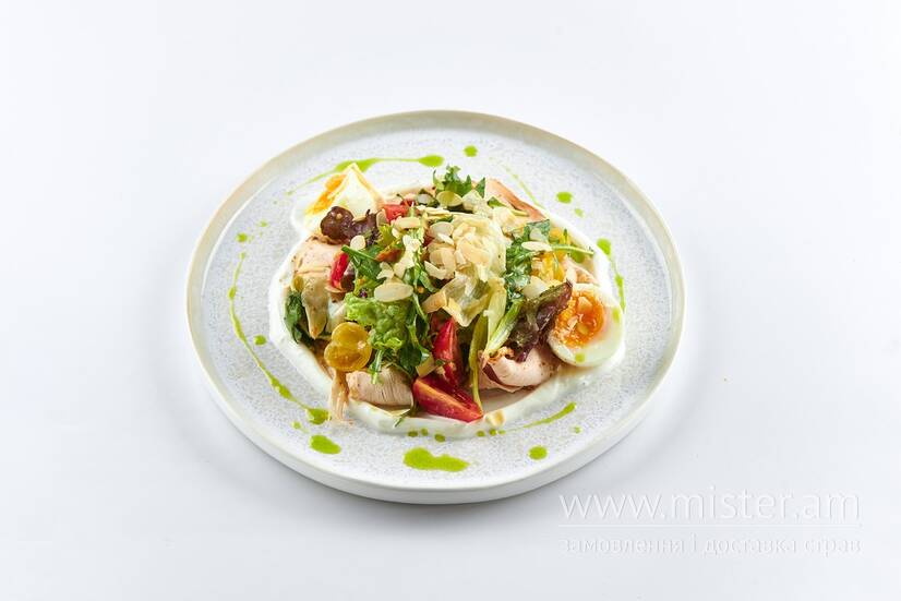 Мікс салатів, сир лабне, помідори чері, куряче яйце, соус медово-гірчичний, пастрамі з індички, мигдалева стружка.