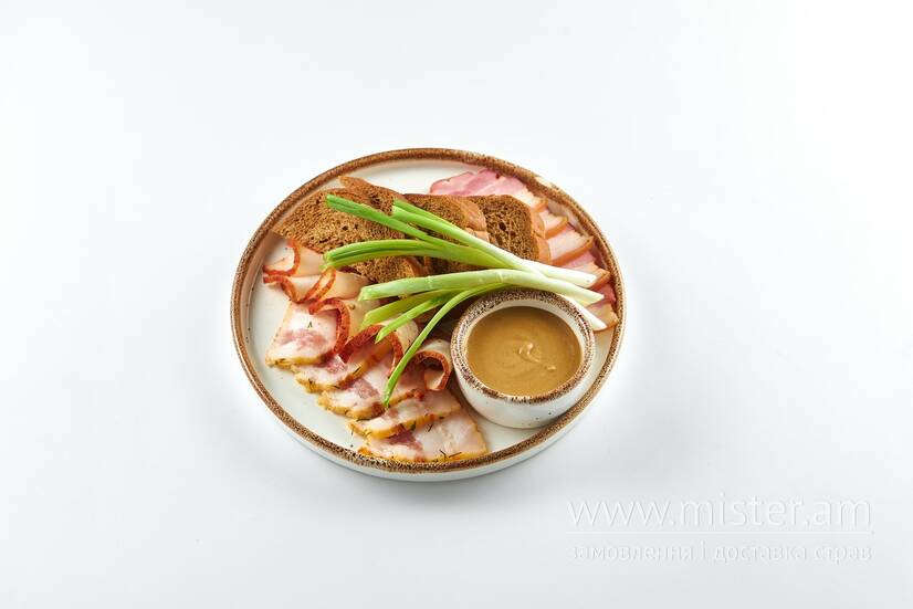 Сало: копчене, мариноване, варене зі спеціями. З гірчицею та зеленою цибулею.