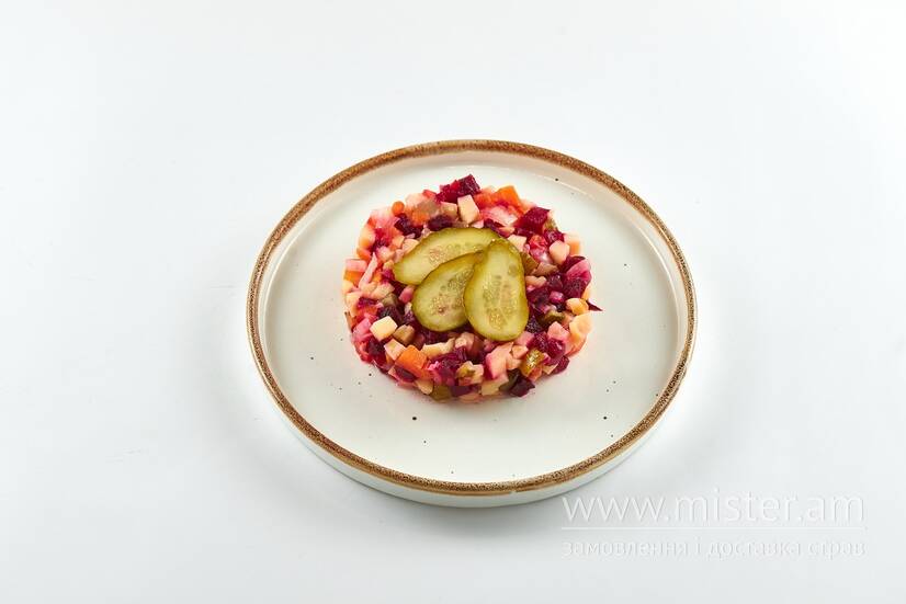 Класичний салат з відварених: картоплі, моркви, буряку, зеленого горошку, цибулі. Запрвлений соняшниковою олією.