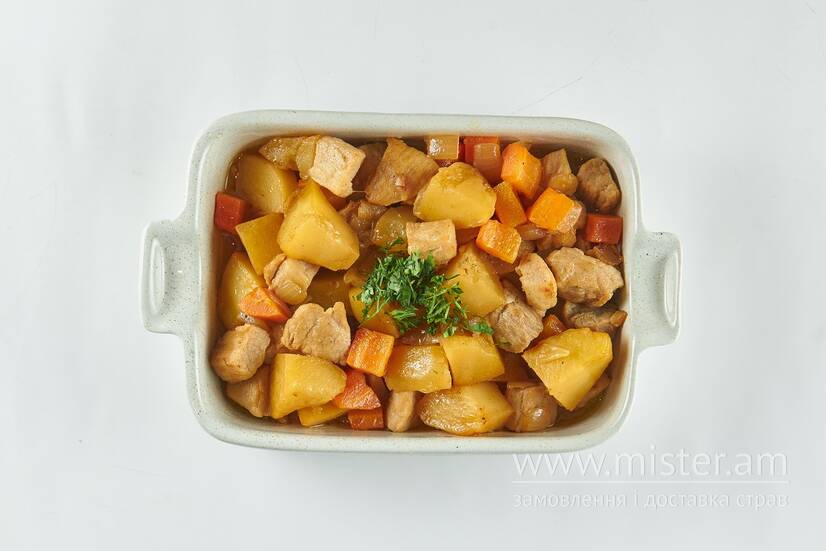 Тушкована картопля зі свининою та печерицями у вершковому соусі.