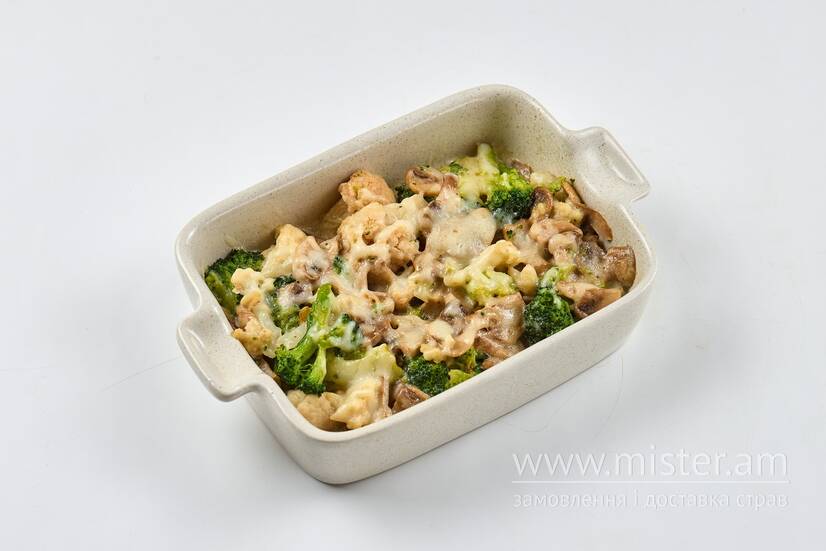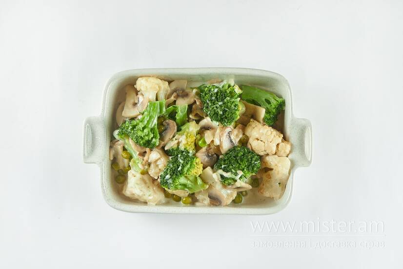 Броколі, кольорова капуста, печериці та горох, тушковані під вершками та моцарелою.