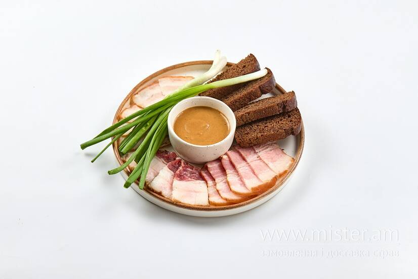 Сало: копчене, мариноване, варене зі спеціями. З гірчицею та зеленою цибулею.