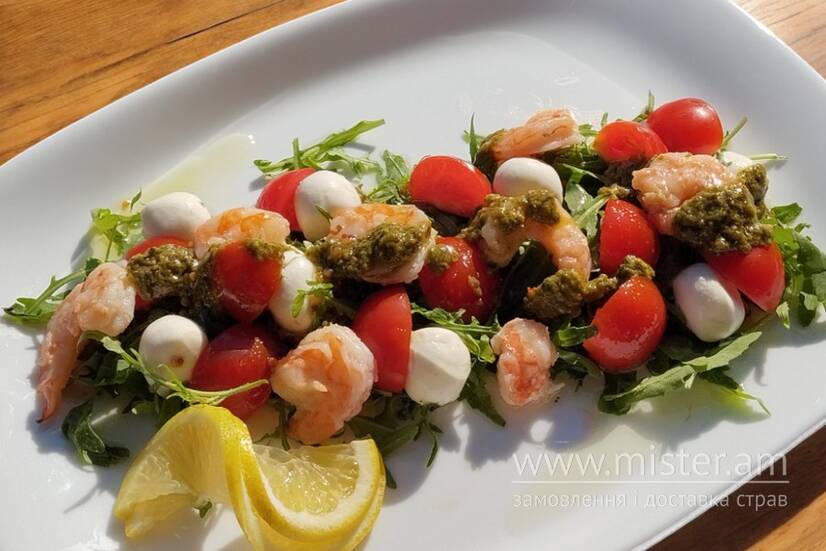 Хвости креветки, сир моцарела, рукола, лимон, соус песто, помідор черрі.