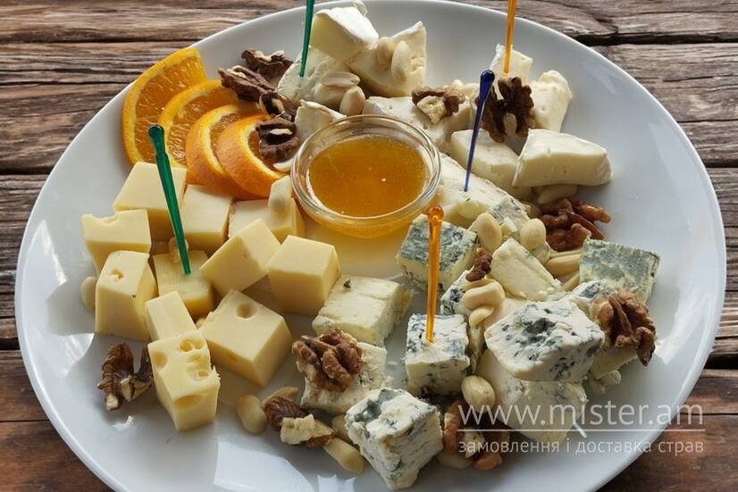 Дор блю, радомер, брі, моцарела міні, горіховий, мед/джем, фрукти.