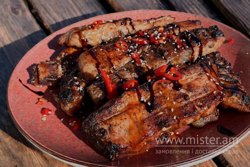 Гриль: Шашлик зі свинини, Скумбрія гриль, Філе лосося на шпажці, Овочі гриль, Свині реберця на грилі, Курячі крильця, Шашлик із курячого філе, Креветки тигрові на шпажці, Стейк зі свинини, Шашлик із телячої печінки, Перепілка, Курка на дровах, Ребра на дровах, Рулька на дровах