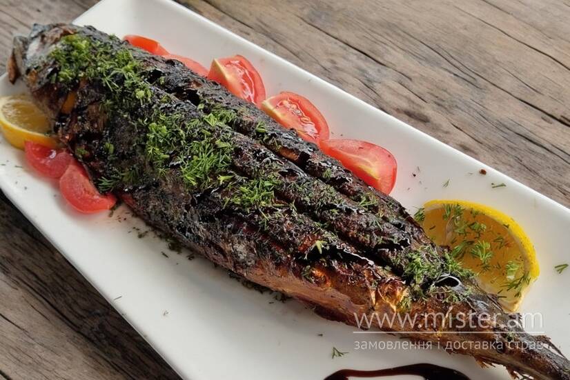 Гриль: Шашлик зі свинини, Короп на грилі, Філе лосося на шпажці, Овочі гриль, Свині реберця на грилі, Курячі крильця, Шашлик із курячого філе, Креветки тигрові на шпажці, Стейк зі свинини, Шашлик із телячої печінки, Перепілка, Курка на дровах, Ребра на дровах, Рулька на дровах