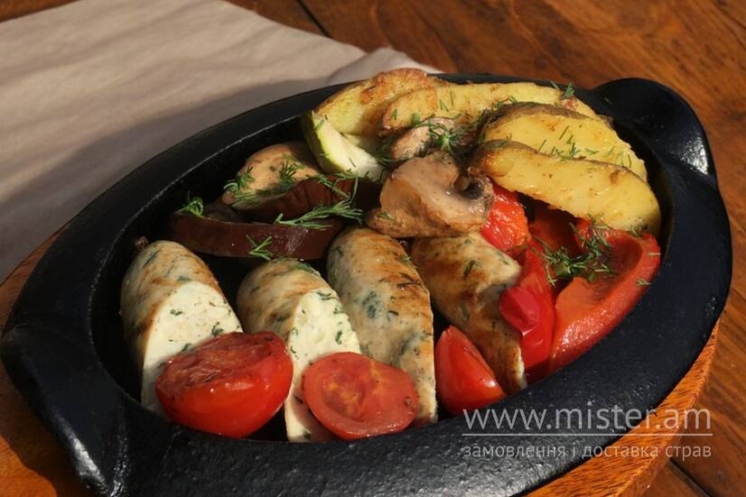 Pidkova Пательня з курячими ковбасками, овочами гриль та картоплею по-селянськи