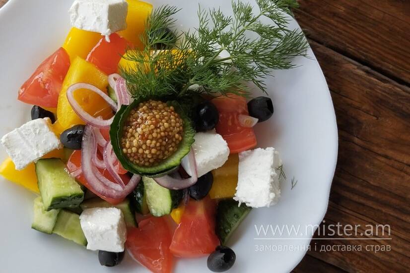 Помідор, перець болгарський, огірок, червона цибуля, маслини, сир фета, оливкова олія, французька гірчиця.