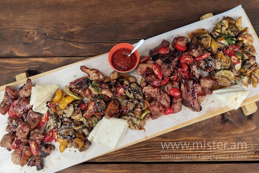 Шашлик зі свинини та курки, курячі крильця, ребра гриль, овочі гриль, лаваш, соус до шашлику.
