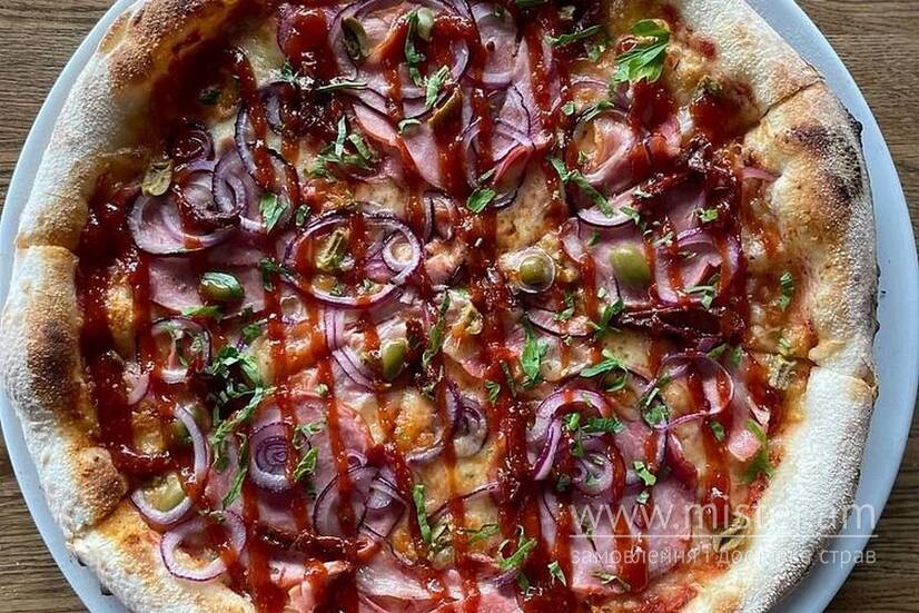 Соус томатний, сир моцарела, бекон, шинка, цибуля червона, оливи, петрушка, соус барбекю.