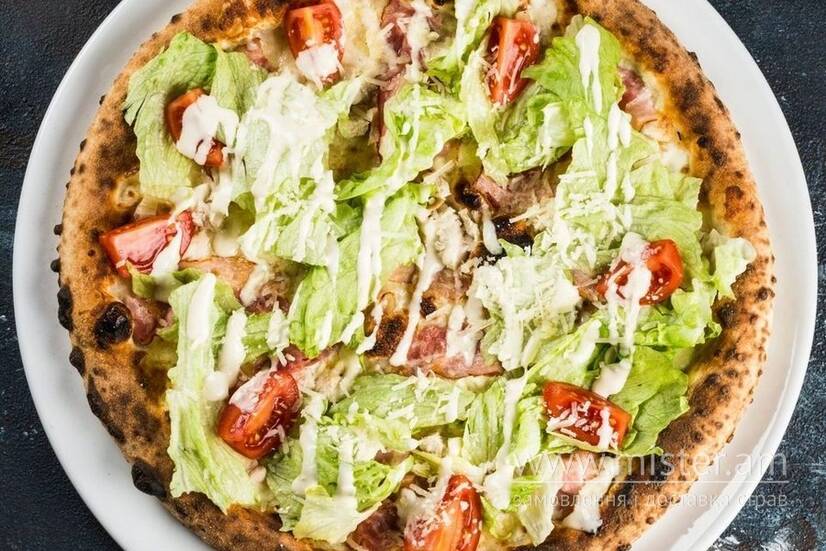 Соус вершковий, сир моцарела, філе куряче,бекон, помідори чері, салат айсберг, сир пармезан.