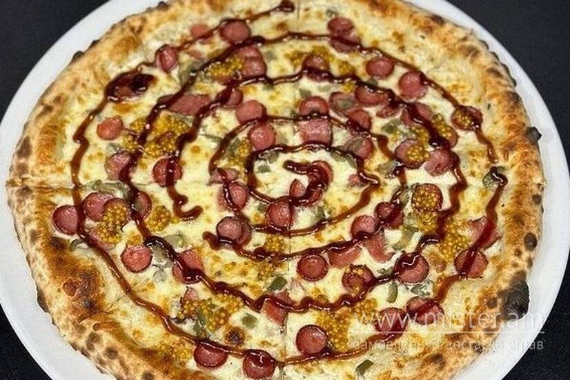 Соус вершковий, сир моцарела, ковбаски мисливські, цибуля червона, французька гірчиця, петрушка, соус BBQ.
