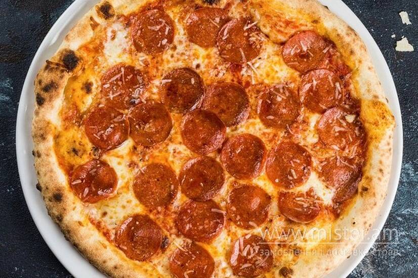 Соус томатний, сир моцарела, ковбаса пепероні.