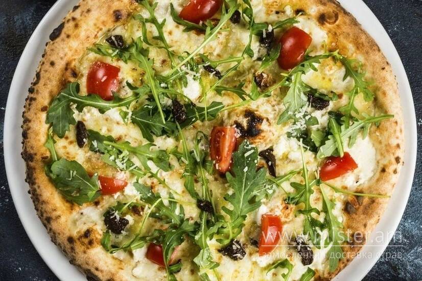 Соус вершковий, сир моцарела, сир горгондзола, сир рікота, паста трюфельна, масло трюфельне, рукола, помідори чері, сир пармезан.