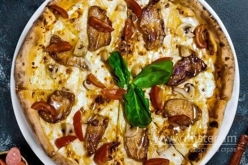Соус вершковий, сир моцарела, печериці, смажена курка, помідори чері, соус медово-гірчичний.