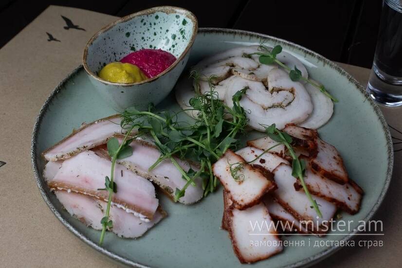 Сало в італійських травах, сало в паприці, сало запечене, хрін, гірчиця, мікрозелень.