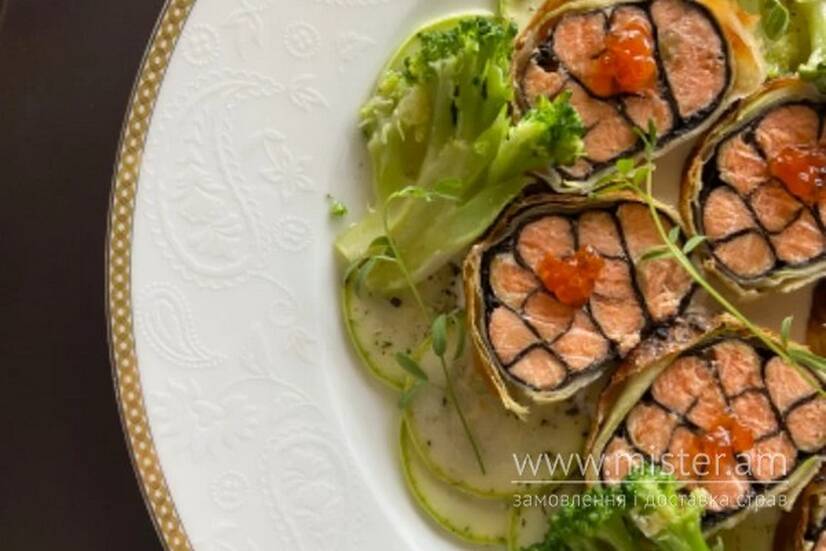 Птаха Лосось велінгтон зі шпинатом та вершковим соусом