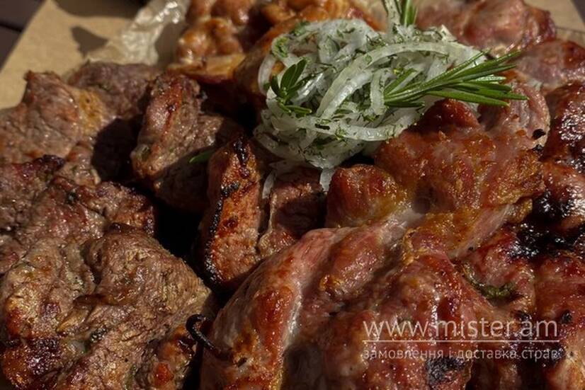Шашлик свинний, шашлик курячий, свині ребра, курячі ковбаски, лаваш, маринована цибуля, соус до шашлику.