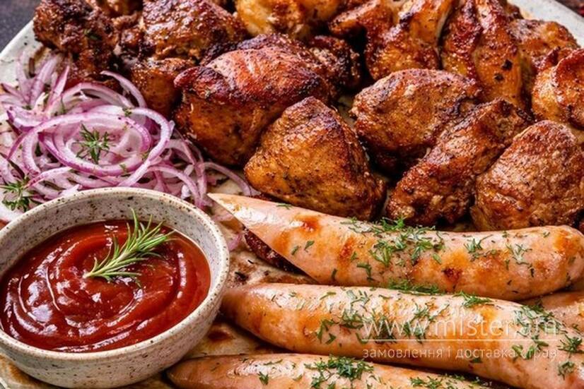 Шашлик свинний, курячі ковбаски, курячий шашлик,соус, маринована цибуля.
