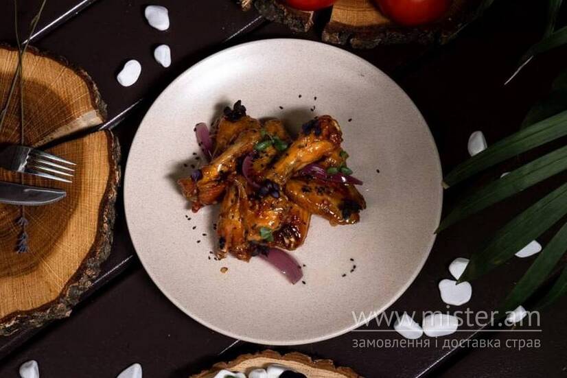 Крильця курячі, світ чілі соус, мікрозелень, кунжут білий.