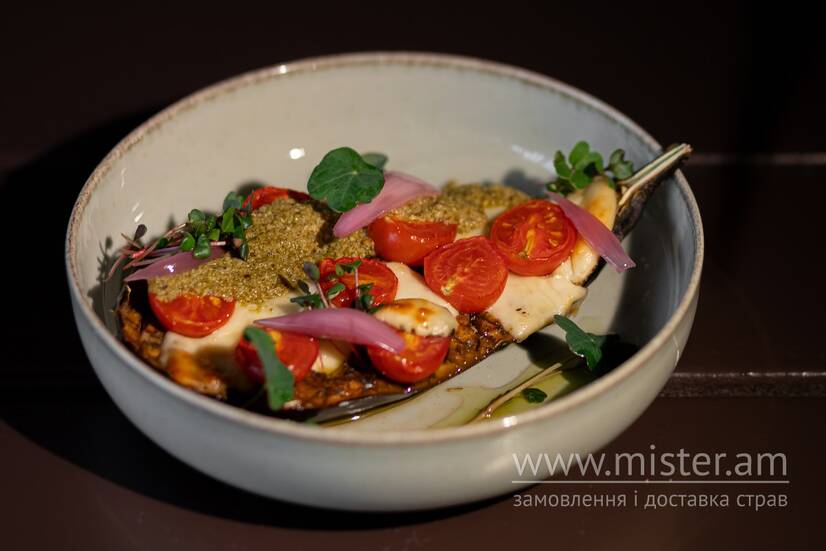 Баклажан, сир моцарелла, соус песто, томати чері.
