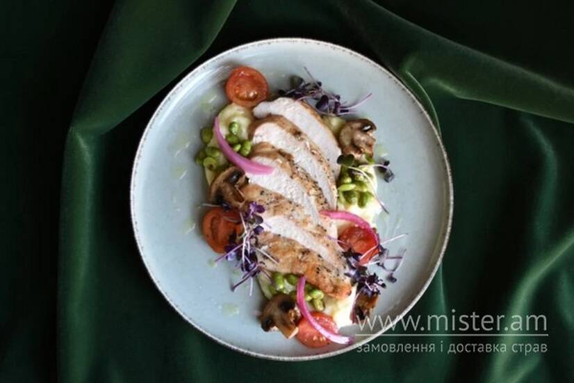 Куряче філе, пюре картопляне, печериці, боби едамаме, томати чері, цибуля маринована, мікрозелень.