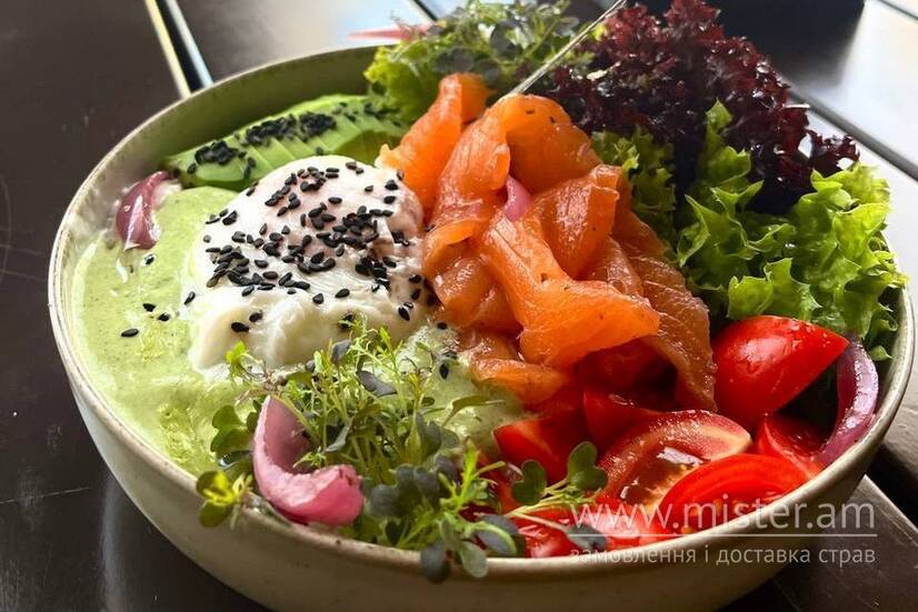 Мікс салату, авокадо, томати чері, лосось слабосолений, рис арборіо, вершки, пармезан, шпинатний соус, яйце пашот.