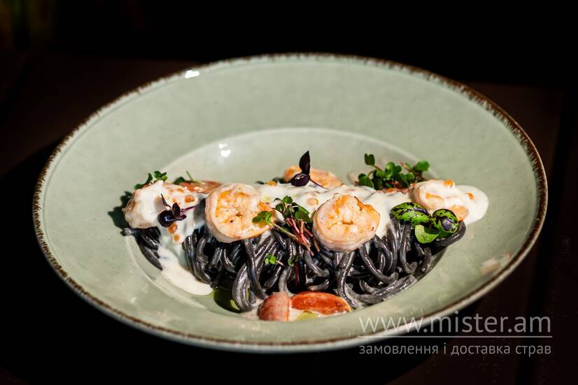 Спагетті з чорнилами каракатиці, вершки, тигрові креветки, червона ікра, томати чері, пармезан, цибуля маринована, зелене масло, мікрозелень.