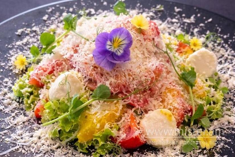 Мікс салату, медово-гірчичний соус, пармезан, грейпфрут, апельсин, лосось с/с, моцарелла бейбі.