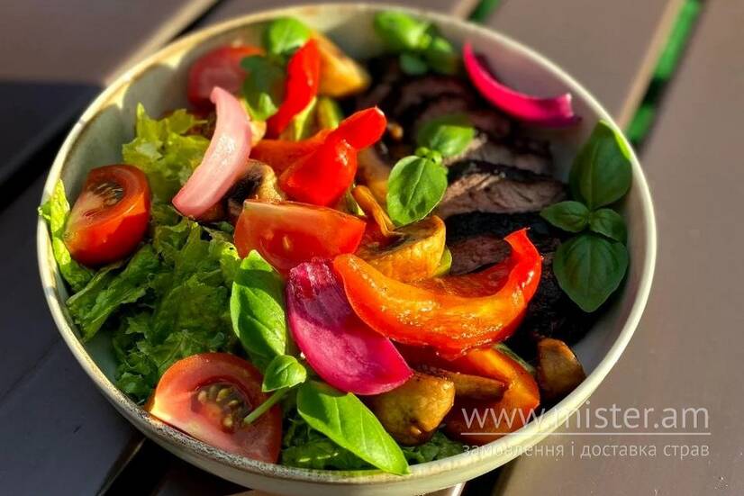 Мікс салату, томати чері, італійські трави, кабачок, перець болгарський, печериці, яловичина, чорнила каракатиці.