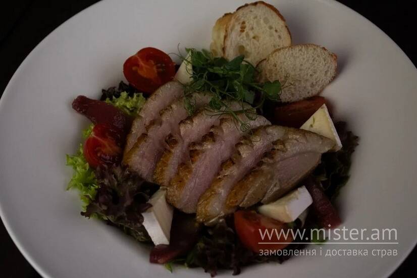 Качине філе, мікс салату, медово-гірчичний соус, томати чері, сир брі, багет, груша томлена в вині.