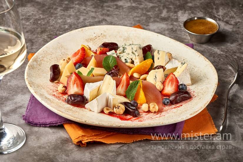 Вишукана добірка сирів із ніжними доповненнями: груша пашот, карамелізоване філе апельсина, сезонні ягоди, фініки, мигдаль та фундук. Завершує композицію трюфельний мед, який додає делікатної солодкої нотки.