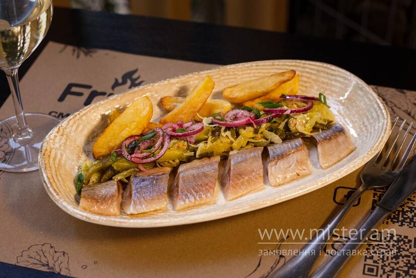 Ніжний оселедець під витонченою цибулевою вуаллю, доповнений смаженою картоплею, хрусткою цибулею та ароматною духмяною олією.