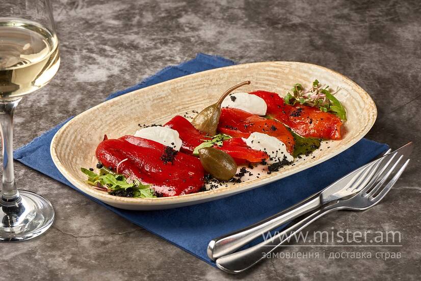 Соковиті мариновані перці гриль у поєднанні з вершковим мусом фета та медово-базиліковою заправкою.
