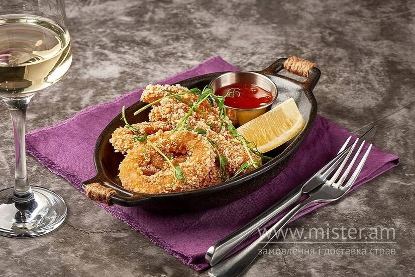Ніжні кальмари, обпановані в хрусткому тісті та обсмажені до ідеальної скоринки. Подаються з легким соусом для додаткового смаку, що підкреслює морський аромат кальмарів.