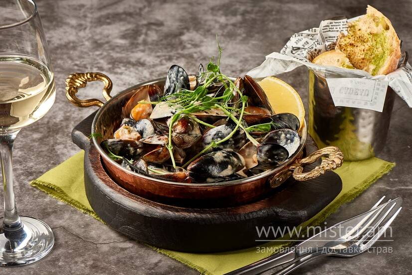 Мідії у вершковому соусі з обпаленим хлібом з пармезаном