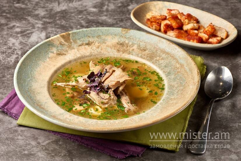 Вишукана уха на основі перепілки з білими грибами, печерицями, домашньою лапшею та перепелиним яйцем. Завершується ароматною зеленню та подається з грінками. Особливий акцент—легкий трюфельний аромат, що робить смак ще більш насиченим.