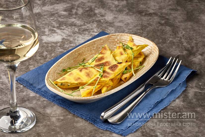 Ніжний лаваш, щедро заповнений ароматною бринзою та свіжою зеленню. Простий, але вишуканий смак цієї страви підкорює своєю легкістю та свіжістю. Ідеально підходить для перекусу або як легка закуска.