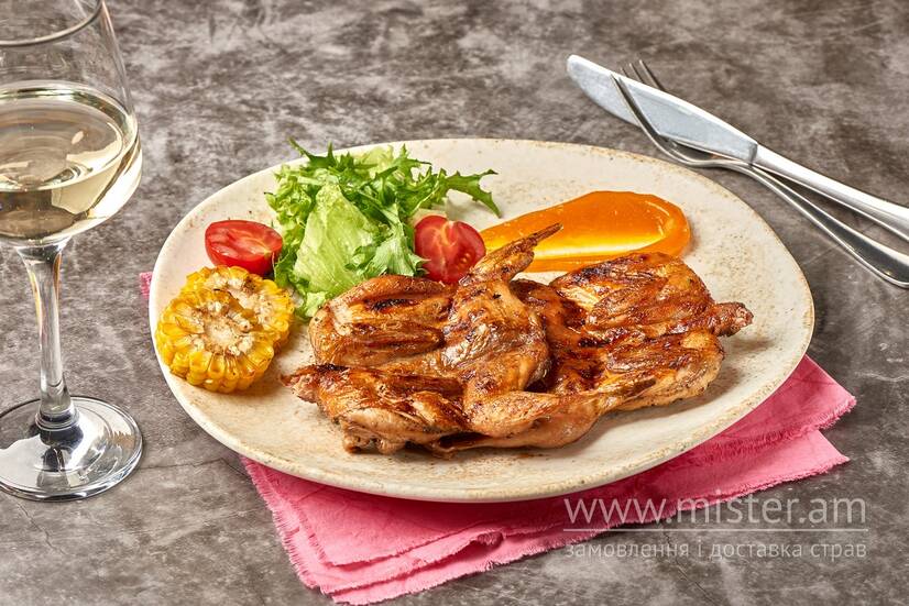 Хрустка перепілка, смажена до золотистої скоринки на грилі, подається з ніжною кукурудзою та незвичайним облепиховим гелем. Ця страва поєднує в собі соковите м'ясо з вишуканим фруктовим акцентом.