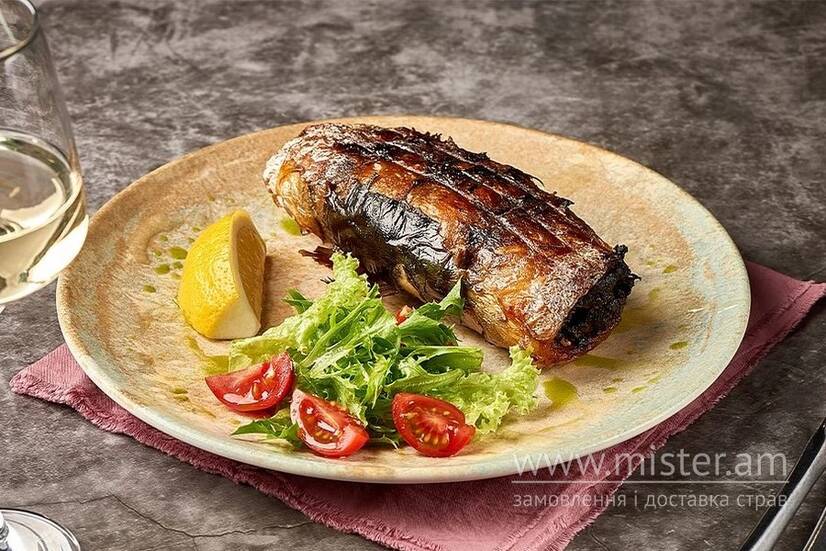 Соковите філе скумбрії, подається з освіжаючим лимонно-гірчичним соусом, смачними томатами та міксом листя салатів. Легка та вишукана страва для поціновувачів морепродуктів.