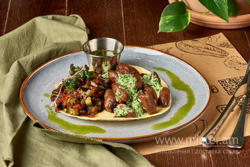 Ніжні курячі сердечка, приготовані на грилі, подаються із зеленим вершковим маслом та грильованим салатом.