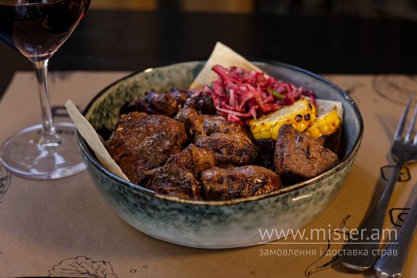 Соковитий шашлик з яловичини, приготований на грилі до ідеального ступеня прожарки, подається з кукурудзою гриль та синьою маринованою цибулею. Страва, що поєднує в собі чудовий смак м'яса та пікантні овочеві акценти.
