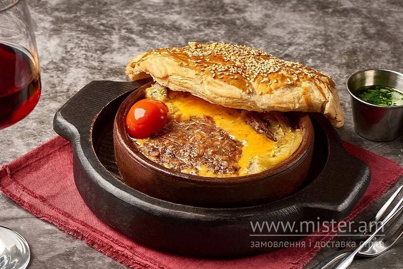 Соковитий яловичий біфштекс, ніжно покритий сиром, смаженим баклажаном та свіжими томати, запечений у хрусткому листковому тісті до золотистої скоринки. Це ідеальне поєднання м'яса, овочів та сиру в одному блюді, яке здивує навіть найвибагливіших гурманів.