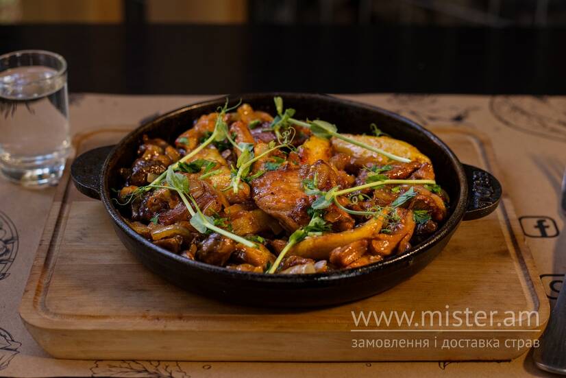 Свинячий ошийок із ароматними білими грибами, опеньками та печерицями, обсмажений із картоплею, цибулею, гострим перцем, часником і зеленню.