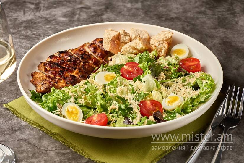 Легкий, але поживний салат із листям молодого салату, перепелиними яйцями та томати черрі. Додаємо хрусткі грінки та ніжний соус айолі, що доповнює смак соковитого курячого філе гриль.