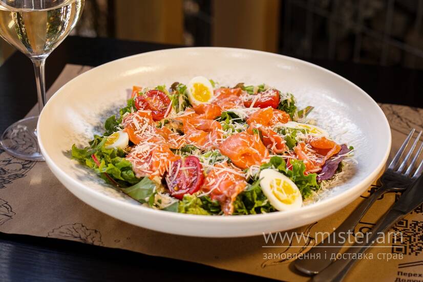 Легкий, але поживний салат із листям молодого салату, перепелиними яйцями та томати черрі. Додаємо хрусткі грінки та ніжний соус айолі, що доповнює смак лосося.