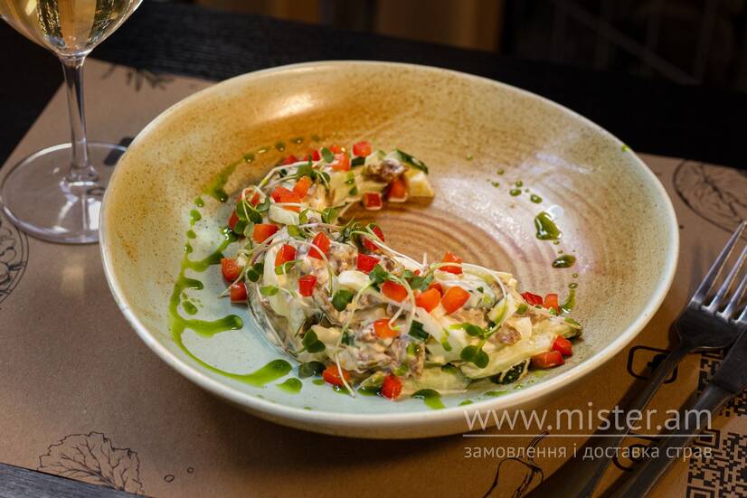 Пікантне поєднання яловичого язика, свіжого огірка, яйця та ніжного майонезу.