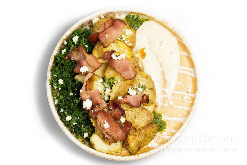 Бита молода картопля, запечена з вершковим маслом і чебрецем, бекон кріспі, свіжа зелень, бринза. Подається з мусом зі сметани та печеного часнику і соусом песто