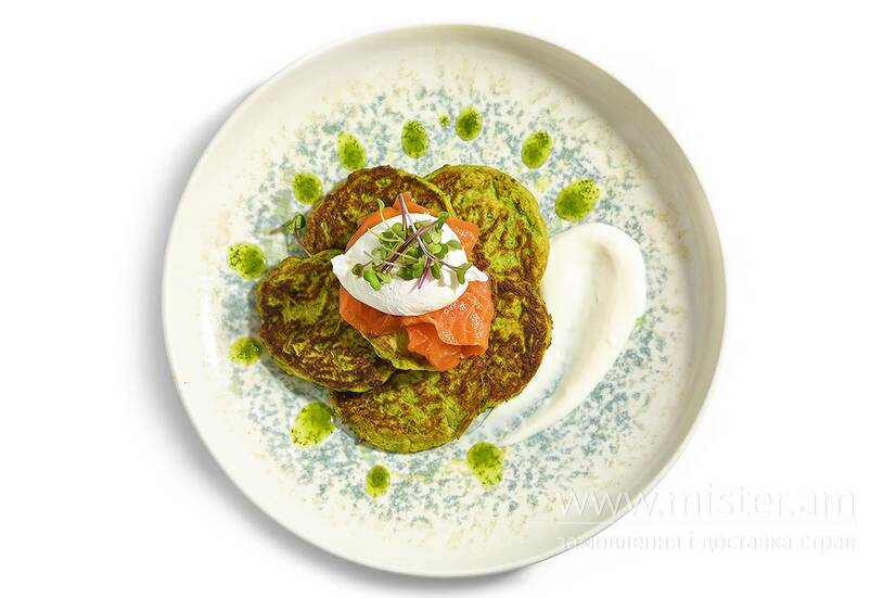 Хешбраун із кабачків, шпинату та пармезану, слабосолений лосось, яйце пашот. Подається з йогуртовим соусом і соусом песто.