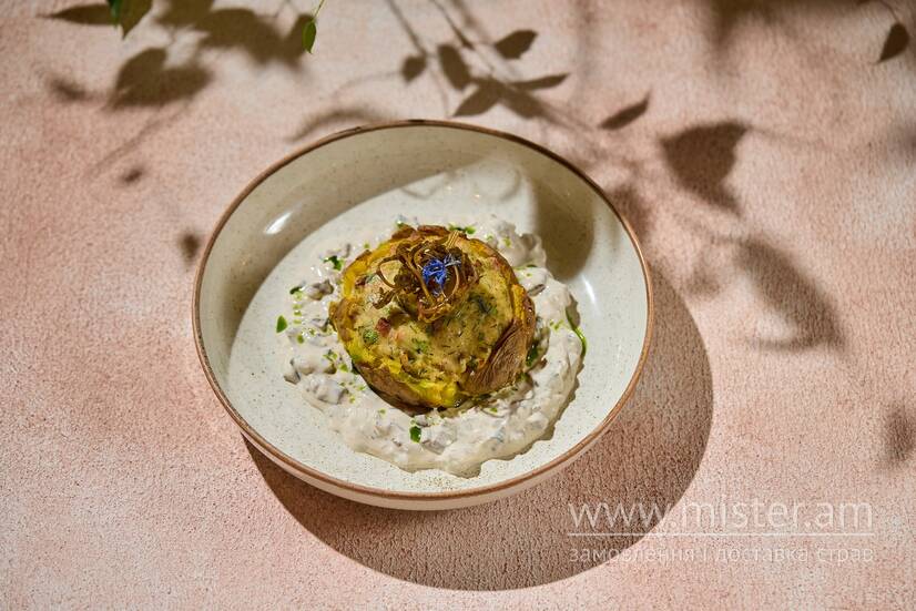 Картопляна тарталетка, начинена беконом, моцарелою, сметаною та зеленню, подається на грибній сметані. Декорована маринованим огірком, портулаком та квітами волошки. Ситна і ароматна страва з цікавою подачею.